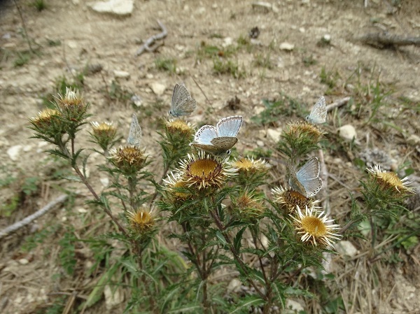 Silbergrüne Bläulinge an der Golddistel; Foto: Stefan Häcker